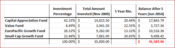 GMK Posted January 13, 2017 Posted January 13, 2017 This is a more realistic estimate than your spouse proposed, even though it may still overstate the account as of June 2014. The starting (November 2009) balances were probably in different proportions to each other than in the 2013 statement. For example, the EuroPacific fund grew much less than the others, so it probably started with a bigger percentage of the total $35k than 26.52%. That would reduce the November 2009 amounts in the other funds, which in turn would bring the June 2014 balance estimate down ... maybe not a lot, but some. In any case, if the employer cannot provide copies of the account statements (and the Plan Sponsor is supposed to hang on to them or be able to get them), then this would be a good counter offer. Good luck.