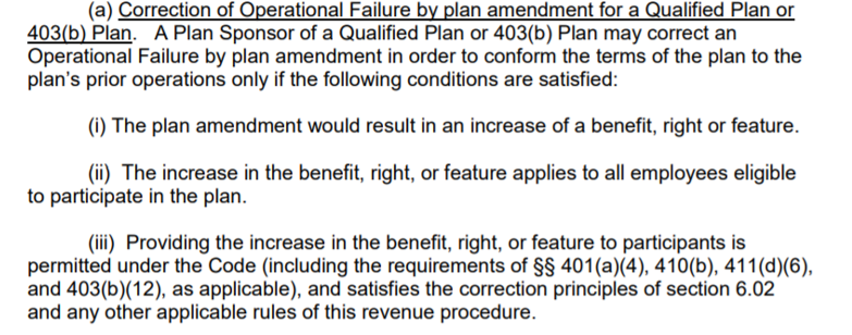 Question is, can we amend the plan now under SCP to provide retroactively for the more generous match that company A and B employees both got, or must we go under VCP ? Section 4.05 (in the SCP section) in Rev. Proc. 2019-19 says the following: